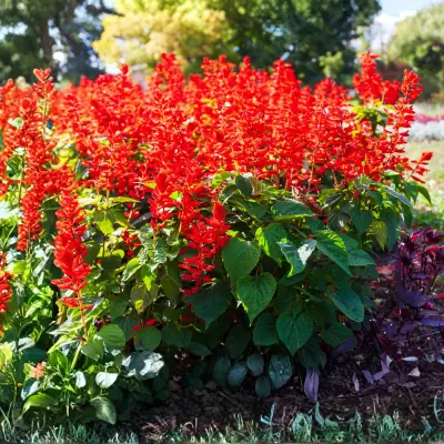 The spikes of salvia are erect in either scarlet or purple, which attract butterflies even in December. Mexican species such as Salvia splendens are sun-loving and require sandy soil, pruned to promote reblooms. Fragrant and insect-welcoming.